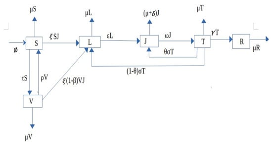 For model (1), together with nonnegative initial conditions, the progression through the compartments is illustrated in Figure 1. New infections in compartment L arise by contact between susceptible and infected individuals in compartments S and J at a rate . Individuals progress from compartment L to J at a rate . The system has a unique disease-free equilibrium with . Taking the infected compartment to be L and J gives