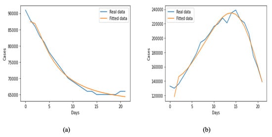 There are different phases in an epidemic curve: the exponential phase, the point of inflections, the peaks, and the decompressed peak. These phases exhibit a slow start, a rapid rise, a levelling off, and a decline. Also, these curves can either be concave or convex. The epidemic curve shows that for Figure 2a, there is a sharp decline in the levelling-off of the curve, which looks like a logarithm curve, while Figure 2b shows a rapid rise, a levelling off, and a decline, which looks like an inverted parabolic curve or a concave curve. We were also able to demonstrate similarity between the simulated, real, and fitted data. Figure 2a captures the simulated active TB individuals in Figure 5a. We notice a similarity in the trend of the curve’s behaviour, which means that if the time is extended, it will perfectly correspond to the nature of the real and fitted data.