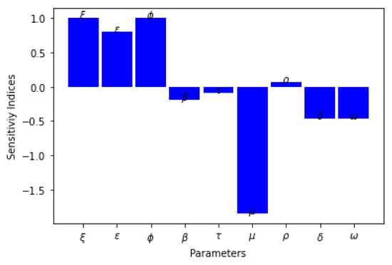 The sensitivity analysis evaluates how the uncertainty of the parameters can affect the dynamics of the epidemic; this is undertaken to reveal the parameter that has the greatest effect on the spread or contraction of the disease. The sensitivity analysis is investigated analytically by taking the partial derivatives of the basic reproduction number with respect to each parameter. The sensitivity analysis of the basic reproduction number with respect to and and the sensitivity index upon evaluation using the parameter values in Table 2 are presented in Table 3. From Table 3, and have positive sensitivity indices, while the other parameters have negative indices. There is a direct relationship between the positive indices parameters with and an inverse relation between the negative indices parameters. The sensitivity analysis result shows that if we increase the vaccine rate and the treatment rate, the basic reproduction number of the disease will decrease, which is an affirmation of the efficacy of the vaccine and the effectiveness of treatment if the population is vaccinated and treatment is given a priority. This will help to prevent the spread of the disease. We present the graphical result of the sensitivity analysis in Figure 3.
