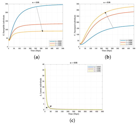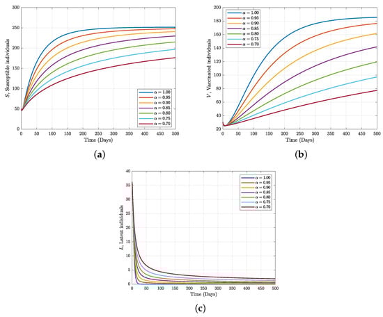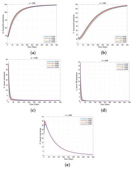 The computational results of the assessment of our suggested Caputo fractional-order model’s Equation (2) deterministic trajectory in the population are displayed in Figure 4 and Figure 5 while keeping all process parameters. We depict a predetermined pattern by integrating all of the compartments of the framework to achieve determinism figures. In deterministic situations, addressing the population’s contaminated individuals using the rate decreases the infectious individuals and increases the population of those who take medication for a set of amount of time. Nonetheless, the system’s Equation (2) dynamics of the curves show realistic behaviour in relation to the mathematical model. According Figure 4a,b, it is easy to see that the compartments start decreasing by decreasing the fractional values, and this shows that physical processes are better explained using the fractional-order derivatives. The operator captured low susceptibility. The biological meaning of this dynamism of Figure 4a–c is that if people have enough knowledge about TB and the rate of the vaccine and its efficacy increase, people will not be exposed to the disease. The dynamics of Figure 4c ensure a low vaccination rate, its low efficacy, and a lack of knowledge about the disease. In Figure 5a–c, compartments start increasing via a decrease in the fractional values. In reality, when we have a large latent or exposed population, this will significantly affect the infected or active TB population. Similarly, the active TB individuals will respond to treatment and recover due to the impact of effective vaccination as a control strategy. In Figure 6 and Figure 7, some of the sensitive parameters are taken to consideration, for example, and . From Figure 6a,b,e, it is easily to see that the susceptible, vaccination, and treatment compartments increase when the rate of treatment for active TB individuals increases, which clearly indicates that if active TB individuals receive good medication, the proportion of recovered people in the population will increase while the proportion of exposed and infected people in Figure 6c,d will significantly decline. Figure 7a–c, clarify the behaviour of the vaccine rate to TB. It is easily to see that the vaccination compartment increases as the vaccine rate increases but not the same as the susceptible and latent classes. This is because when the vaccine works with the rest of the immune system to destroy the pathogen and stop the disease, people who are susceptible move from the susceptible class to the vaccination compartment, which causes a reduction in the latent class. By increasing the vaccine rate to TB by 5% (i.e., ) as the estimated value, a reduction in the exposed infection is observed. This means that the higher vaccination interaction between the population, the greater the chances of a decrease in the transmission rate to TB, which will lead to elimination of the disease.