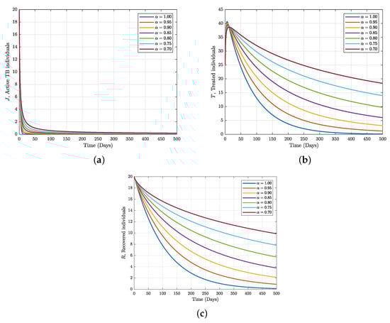 Numerical tuberculosis trajectory for active TB, treated, and recovered individuals under Caputo operator with a different fractional order, .