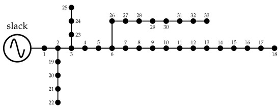 To validate the effectiveness and robustness of the proposed leader-follower optimization methodology to locate and size PV units and D-STATCOMs in medium-voltage distribution networks, the IEEE 33- and 69-bus grids were used as test feeders. The schematic nodal connection of these feeders is presented in Figure 1 and Figure 2, and their electrical parameters regarding branches and peak load consumptions are listed in Table 3 and Table 4. Note that the main characteristics of these test feeders are their radial structure and their voltage profile, which is equal to 12.66 kV at the terminals of the substations located at node 1 in both cases. In addition, the voltage regulation bounds were assigned as .