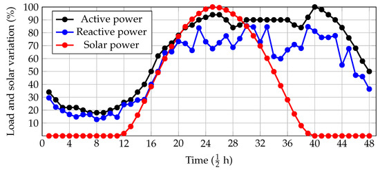 To define the expected behavior of the electrical distribution network for the planning period, the solar availability and the active and reactive power consumptions in the area of influence of the studied distribution network are presented in Figure 3.