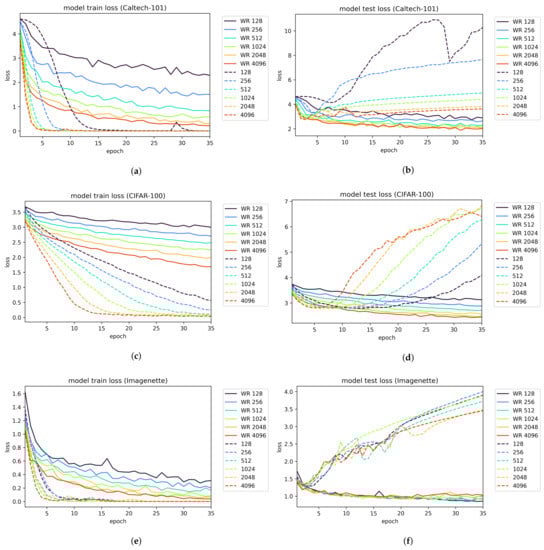 Plots of the training and test losses for models trained on three datasets. Each model contains a different number of neurons in the penultimate dense layer. The correspondence between the losses and the number of neurons is indicated in the legends of the individual plots. The losses of the models trained with the Weights Reset regularization technique are represented using solid lines, while the losses of the models trained without additional regularization are shown using dashed lines: (a) train and (b) test losses for Caltech-101, (c) train and (d) test losses for CIFAR-100, (e) train and test (f) losses for Imagenette.