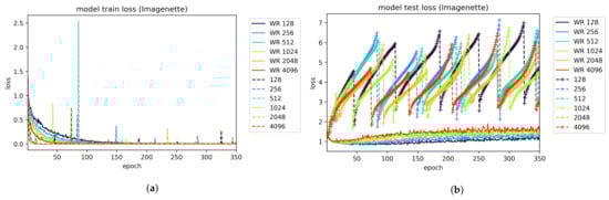 Plots of the training and test losses for models trained on the Imagenette dataset. Each model contains a different number of neurons in the penultimate dense layer. The correspondence between the losses and the number of neurons is indicated in the legends of the individual plots. The losses of the models trained with the Weights Reset regularization technique are represented in solid lines, while the losses of the models trained without additional regularization are shown using dashed lines: (a) train and (b) test losses. To enhance visual clarity, the obtained test loss values without the use of regularization are denoted by a plus symbol.