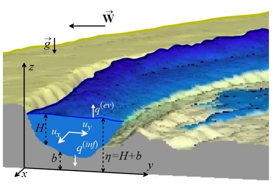 where is the surface water depth, is the velocity of the vertically averaged flow determined by the x and y components (), q is the functions sum of sources () and sinks () of water, g is the acceleration of gravity, is the specific force associated with the given source function q (because changes in mass due to q cause corresponding changes in momentum). The specific force depends on various factors [33,37,72], including the bottom friction , the Coriolis forces, the wind action with speed of , the internal friction due to turbulent viscosity, etc. (Figure 1). Equation (3) is the mass conservation law for an incompressible liquid layer with the source q. Equations (4) and (5) determine the law of change of two momentum components under the action of forces on the right side of these equations.