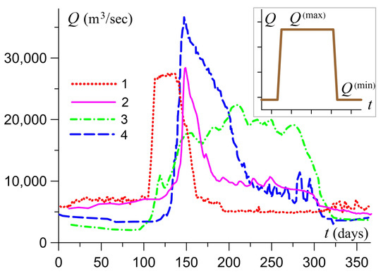 Examples of rivers water discharge: 1—The Volga river at the gauging station Dam Downstream of the Volga HPP in 2016; 2—the Yenisei River at the gauging station in the village Podkamennaya Tunguska in 2016; 3—the Amur River at the gauging station at the Komsomolsk in 2016; 4—the Ob River at the gauging station at the Salekhard in 2016. The inset shows the model hydrograph used in what follows.