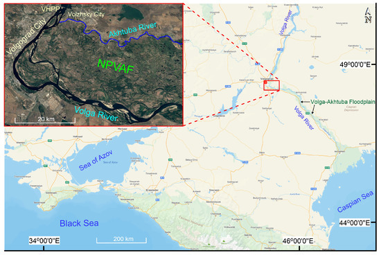 Geographical position of the Northern part of the Volga-Akhtuba floodplain (NPVAF) in the lower reaches of the Volga river (Yandex.Maps + Image Landsat/Copernicus).