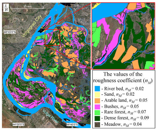 The DHLM is based on a digital elevation model (DEM) and data on the hydrological network, which is a vector map of all watercourses. Small-scale inhomogeneities of the underlying surface provide hydrological resistance to the flow, which requires specifying in (6) the spatial distribution of the roughness coefficient on the grid (Figure 4). Different colors show different levels of ), which are determined, among other things, by the nature of vegetation, soil properties, building density, etc. For the study of groundwater hydrology, the DHLM contains data on the depth of groundwater water, soil characteristics, infiltration coefficient, and porosity coefficient. In addition, water dynamics may depend on meteorological characteristics, such as the amount of precipitation, snowmelt patterns, and the rate of moisture evaporation.