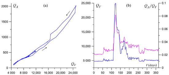 The value of water flow from the Volga river to Akhtuba plays a key role in the hydrological regime of the entire floodplain. The water discharge in the Akhtuba River directly depends on the discharge in the Volga river . Figure 5 shows such a hydrological relationship based on the results of numerical simulation for 2022, which has a characteristic hysteresis shape. The ratio is in the range of 0.02–0.08, and only two percent of the Volga’s water enters the Akhtuba during the low season. The spring flooding stage is characterized by an increase in this proportion to 8 percent at its peak.