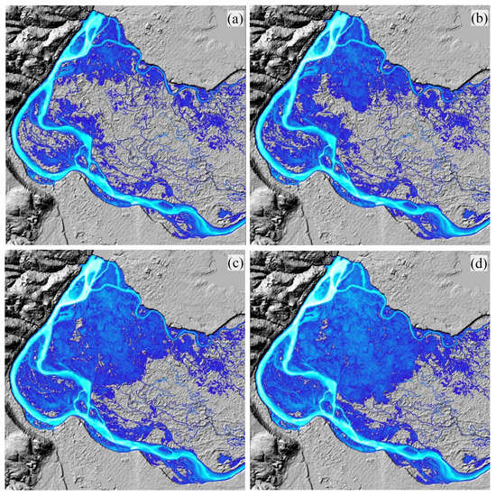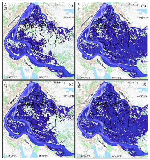 Flooding maps of the Volga-Akhtuba floodplain at the time of h at: Q = 65,000 ms, Q = 100,000 ms (a,b); Q = 150,000 ms, Q = 200,000 ms (c,d).