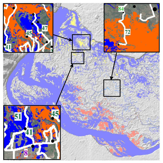 Figure 7 shows the result of the flood simulation at = 45,000 ms at time h for two models . Red color highlights areas that are flooded in the model const, but remain without water when const. Yellow color defines areas under water at const, but not flooded at non-uniform . Blue color indicates areas flooded in both cases. The upper left inset shows the result of flooding at time h: orange highlights the flooded areas in the model const, blue is the result for const. Some HSs and ERs (for example, No. 47) are flooded when const. Similarly, the lower inset depicts calculations at the time h, when ERs No. 8, 41, 51 are flooded at const; however, settlements and above escape routes are not flooded in the model const. The upper right inset ( h) demonstrates the opposite situation, when the calculation with const gives the flooding of both the settlement and ER No. 72. Thus, the heterogeneity of the roughness coefficient seems to be an important factor in modeling the hydrological regime for solving the problem of organizing evacuation.