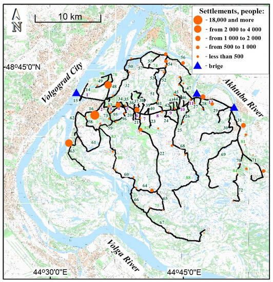 The map of the NPVAF road network with the numbers of its local sections (edges of the graph G) and the location of settlements are shown in Figure 8. The triangles mark bridges across the Volga and Akhtuba rivers, where permanent EPs are also located. Table 2 describes the composition of ERs. The algorithm for solving the problem (7)–(9) involves moving the released vehicles to new routes during the evacuation. The road connecting permanent EPs is not flooded by hydrographs at 60,000 m s. Therefore, the paths of vehicles between ERs are free from flooding.
