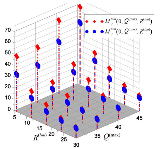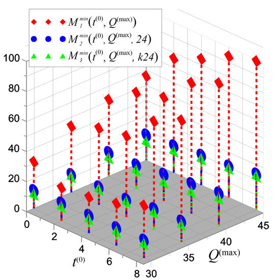 We assume that the beginning of the 2nd stage of evacuation at each ER begins immediately after the end of the 1st stage. The set of beginning moments of the 2nd stage is described by the vector . A formal statement of the problem of minimizing the number of vehicles M on the sets of safe schedules (7), (8) and STER with parameters Q, , has the form: