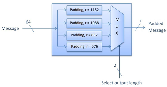 The padding scheme used in SHA-3 consists of a 4-to-1 multiplexer. The output length of the algorithm determines which padding scheme is used. For example, if the output length is set to 224 bits, then the padding scheme for bits is used. The padding scheme is shown in Figure 3.