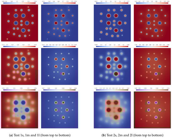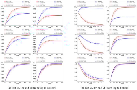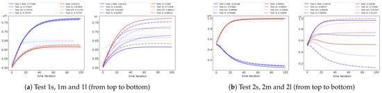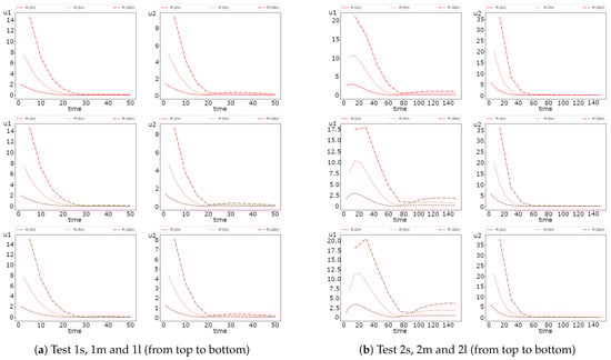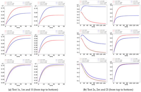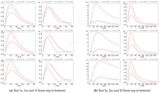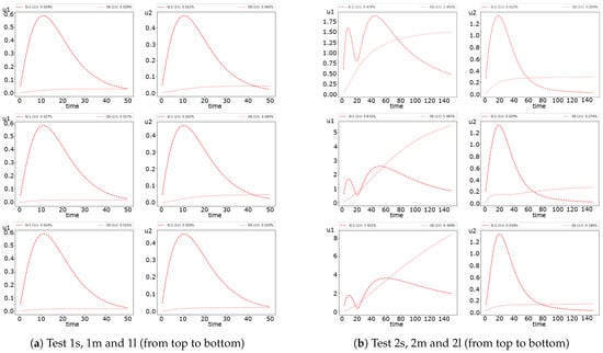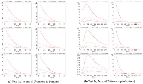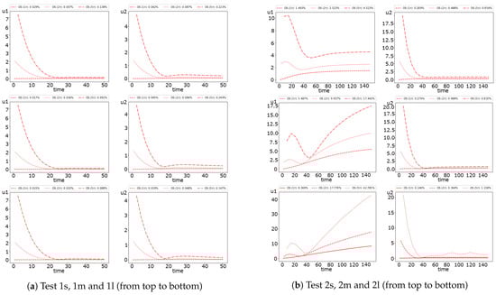 In Figure 8, we represent the error dynamic for the semi-implicit and operator splitting method. We see that the operator splitting method errors for the first species in Test 2 has an increasing behavior. Moreover, we obtain significant errors for a larger diffusion. For example, we obtain of error in Test 2l, of error in Test 2m and of error in Test 2s. The errors for both uncoupling methods are similar for Test 1, with less than one percent of errors. The results also illustrate that the operator splitting method is better than the semi-implicit approximation in Test 1. Nevertheless, in Test 2, we observe the opposite case with more minor errors for the semi-implicit scheme. The presented results of the errors also illustrate the dynamics of uncoupling errors, where the semi-implicit approach gives a more significant error in the first half of the simulation’s time and rapidly decreases after that. The operator splitting error dynamics is entirely different, where the accurate approximation is performed at the begging of the simulation time.