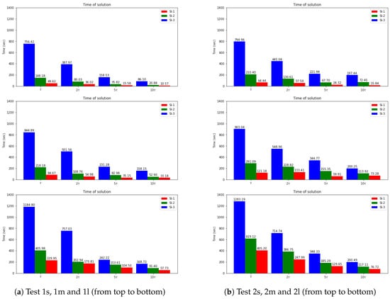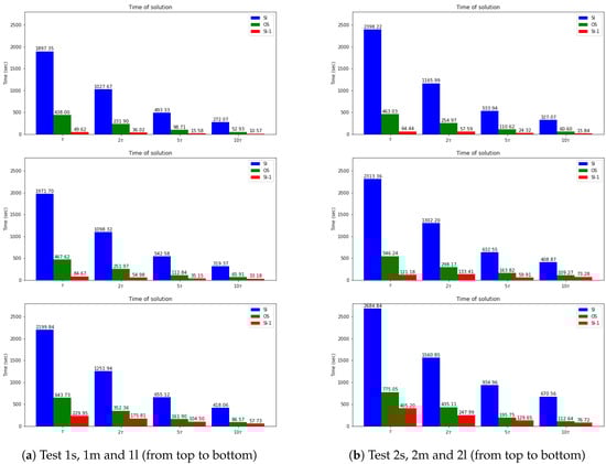 Finally, we present the solution time for uncoupled schemes and compare them with the fully implicit scheme. Note that the main characteristic we want to reach is the separate equation solution for each species (uncoupled scheme). By uncoupling the problem, we are constructing a fast computational algorithm. In Figure 11, we present a bar plot for calculation time for three semi-implicit schemes (SI-1, SI-2, and SI-3). We observe that the coupled scheme SI-3 leads to a slower computational algorithm due to the solution of the large coupled system at each time step. The decoupled approaches SI-1, and SI-2 are faster, where the fastest algorithm is related to the fully explicit approximation of the reaction term. We also observed from the previous numerical results that the SI-1 method has good accuracy for such problems. The time of calculations for the explicit–implicit scheme (SI-1), operator-splitting scheme(OS), and fully implicit scheme (FI) are presented in Figure 12. We note that the quickest algorithm is provided by the SI-1 method. For example, the solution time using the SI-1 scheme is approximately 49 and 64 s for small diffusion in Test 1 s and 2 s, respectively. For more significant diffusion values, we have more significant calculations time with 229 and 405 s for Test 1m and 2m (medium diffusion) and 57 and 76 s for Test 1l and 2l (large diffusion). Compared with the fully implicit scheme, we obtain a 37–38 times faster solution for SI-1 and a 3–4.3 faster solution for OS for small diffusion test cases. We have a 19–23 times faster solution for SI-1 and a 3.4 times faster solution for OS for the medium diffusion. For the large diffusion case, we have a 6.6–9.6 times faster solution for SI-1 and a 4.2 faster solution for OS. Therefore, the SI-1 scheme is preferable due to it having the most straightforward implementation and the faster solution. However, the accuracy highly depends on a test set of parameters, and the correct choice should be performed for each case.