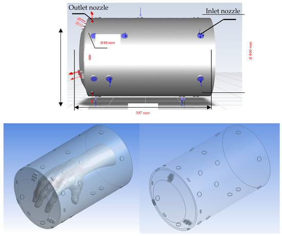 Due to the development of computer technology, CFD is now widely used to estimate the motion and hydrodynamic properties of objects in a fluid environment. Most studies are based on Navier–Stokes equations and initial boundary conditions to analyze and obtain velocity values, pressure distribution, kinetic energy, etc. To analyze various fluid flows, we can use continuity equations, momentum equations, and energy equations. Since it is too difficult to calculate all the hydrodynamic values when analytically solving these equations, CFD was applied to derive the results. However, estimating values via CFD helps to improve accuracy and reduce computation time. Feurhuber et al. [15] applied this approach to much of his research. The CFD model of the steam sterilizer was developed to simulate the inactivation of microorganisms at each position within the steam sterilizer [21]. The results indicated that the simulated temperatures are in very good accordance with the measured data. The CFD approach is applied to develop all of the phenomena that occur inside the steam sterilizer, and particularly inside the hollow load PCD tests [22]. Ref. [23] examined the reality of hand washing in some low-income countries around the world, where people have difficulty accessing hand-washing chambers. All of the research presented below shows that the use of CFD to predict the hydrodynamic properties and motion of liquid flow in a sterilization chamber is suitable.