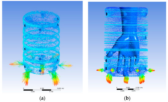 In Figure 3, a typical mesh is used in the computational domain for the hand-washing rotating chamber in the cases of without a hand and with a hand. In the first case, that is, without a hand inside the chamber, there are 132,643 nodes and 678,774 elements. The other case, which has one hand in the chamber, has 287,429 nodes and 1,158,678 elements in total. The maximum skewness of the mesh was 0.8373 and the maximum aspect ratio was 9.98. All of the surfaces, including of the human hand, are set as walls, and the inlets are located in the nozzles, which have a speed of 2–7 m/s. The orientation of this flow is perpendicular to the inlet.
