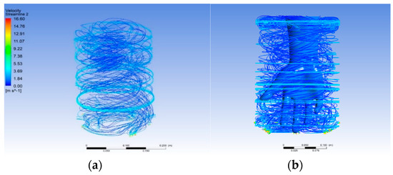 Figure 7a shows the flow distribution of the chamber at different times; the nozzles in turn spray a stream of hand-washing liquid. Based on the rotating mechanism of the hand-washing machine system, these hand-washing liquid lines will rotate at a speed of 40 rad/s. Here, the various times are considered to observe the change in hydrodynamic characteristics of the flow in the chamber when the hand-washing system operates. During this period, the vortexes around the hands change significantly. Initially, the liquid is sprayed from the nozzles and the rotation speed of chamber is not reached (40 rad/s), so the liquid hits the chamber wall and bounces back to form whirlpools, which are created at different positions in the chamber by the liquid being partially held by centrifugal force on the walls of the chamber. In addition, when the liquid flows from the nozzle holes to the opposite wall, the liquid creates straight lines. Because there are no flow obstructions, the velocity of the liquid when entering the middle of the chamber is slightly reduced. Figure 7b shows the flow distribution of the liquid at different times. At t = 1 s, the liquid flows ejected by the nozzles produce the same phenomenon as in the case without a hand at the beginning. However, at this time, the hand is an obstacle that prevents the fluid from moving in a straight line. The flow of liquid moving to the hand creates many small vortexes that are not very concentrated around the hand. At a later time, the vortexes are more concentrated around the hand.