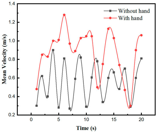 The mean velocity value inside the hand-washing chamber in the two cases without a hand and with a hand.