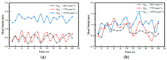 Figure 10 illustrates the mean velocity through a point with rotation at a speed of 40 rad/s for the inlet flow rates of Q = 462 mm3/s, 770 mm3/s, and 1078 mm3/s. Figure 10a shows that, for the different inlet flow rates, the velocity through a point does not change much with the rise and fall in the fluid velocity in the hand-washing chamber. For the case of Q = 1078 mm3/s, the average velocity is greater than that in the other two cases due to the change in the inlet flow. The velocity of the fluid that passes through the surveyed point increases because the drainage holes are not drained in time. If the water flow is too high, the fluid particles will be splashed out. In Figure 10b, we selected the point position for the model with the hand in the middle of the finger gap. In this case, the graph shows that there are times when the velocity changes are larger than in the case without a hand; at these times, large whirlpools are created to help remove bacteria. In particular, after the initial time, the hand-washing chamber starts to achieve the operating number of revolutions and the amplitude of the speed fluctuation is more pronounced, proving that the hand-washing chamber works effectively to clean hands.