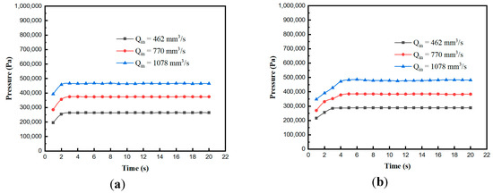The pressure value inside the hand-washing chamber at different inlet flow rates in the cases of (a) without a hand and (b) with a hand.