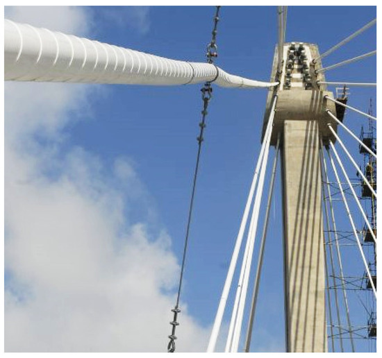 The continuous growth in the span length of cable-stayed bridges leads to longer stay cables, which are more flexible and prone to large-amplitude vibrations [1,2,3,4]. Besides the aerodynamic treatment of cable surface [5,6] and installing supplemental damping devices [7,8,9,10,11,12], the cross-tie solution is another typical countermeasure for suppressing unfavorable vibrations of bridge stay cables [13,14,15,16]. Cross-tie(s) can be employed to connect a vulnerable cable transversely to its neighboring ones and form a cable network, as shown in Figure 1. Studies in recent years show that such a measure would enhance the in-plane stiffness of the vulnerable cable [17,18], introduce additional damping to the connected cables [19,20], increase the modal mass of the vibrating system [21], and redistribute energy contained in the consisting cables [22]. In conjunction with these, it has been confirmed experimentally that the cross-tie solution could also improve the aerodynamic stability of a cable by eliminating the wake effects induced by the proximity of neighboring cables [23,24]. On the other hand, however, the cross-tie solution has a few critical drawbacks, including limitations in suppressing out-of-plane cable vibrations and the inability to directly dissipate energy from oscillating cables unless the cross-tie material itself can dissipate energy [25,26].