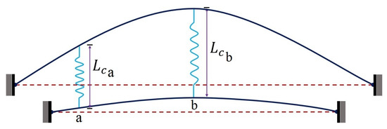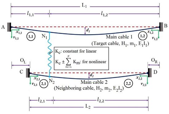 Illustrated in Figure 2 is a configuration of a cable network comprising two horizontally positioned flexible shallow cables. These cables are linked by a transverse cross-tie. Main cable 1 is assumed to be the target cable, which is vulnerable to dynamic excitations and could experience large-amplitude oscillations. Main cable 2 serves as a colleague cable to assist in vibration control of the target cable. The th cable () is characterized by its length (), the mass per unit length , the chord tension , and the bending stiffness , where and are the Young’s modulus and the moment of inertia of the cable cross-section, respectively. The sag at the mid-span of the th cable is represented by . Both cables are fixed at two ends. The horizontal displacement of cable 2 from the left and right side of cable 1 is represented as and , respectively (). A transverse cross-tie is installed at a distance from the left end of the target cable (). It divides each cable into two segments. In addition, it is assumed that vibrations of the main cables are dominated by the in-plane transverse motion, whereas that of the cross-tie is dominated by the longitudinal oscillation. Thus, this study disregards the longitudinal motion of the main cables and the transverse motion of the cross-tie. Notably, a positive value is ascribed to the downward vertical displacement.