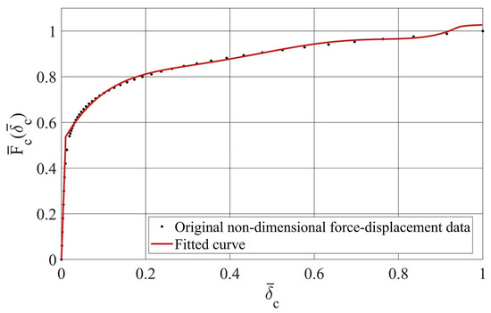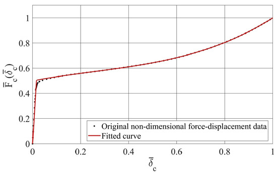 Fitted curve to the original non-dimensional force-displacement data of the cross-tie material (strain-softening behavior).