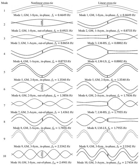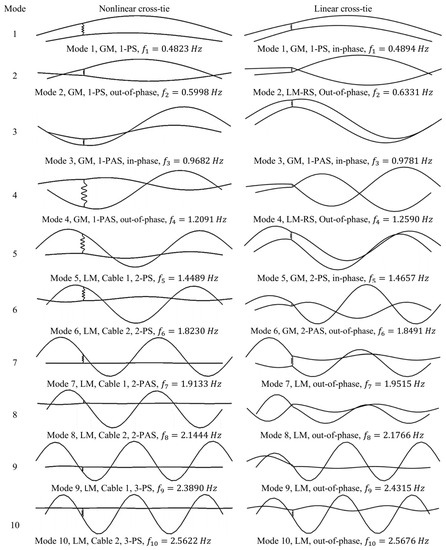As an illustration of a more general example, this section examines the modal behavior of a symmetric unequal-length two-cable network with a nonlinear cross-tie placed at the quarter span (i.e., and ). In this setup, the two constituent cables are assumed to possess the same properties as the main cables outlined in the first example, except the neighboring cable has a shorter length of . The horizontal offset on both ends of cable 2 are the same, i.e., . The same nonlinear restoring force model used in the first example is considered, and the arbitrary amplitude constant is assumed to be 0.0003. Similarly, modal analysis has also been conducted for the linear cross-tie case with . Table 2 presents the modal characteristics of the initial 10 modes within the investigated two-cable network, encompassing both the instances of a nonlinear cross-tie and a linear one. These respective mode shapes are illustrated in Figure 5.