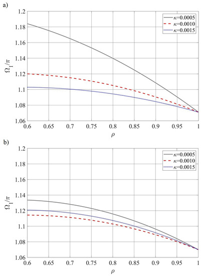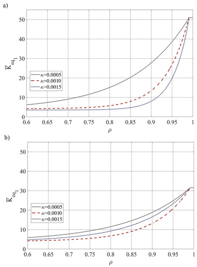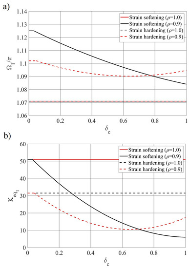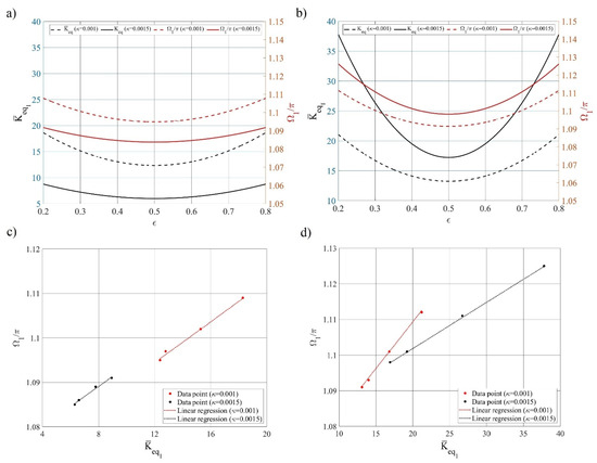 As indicated in Equation (8), the equivalent linear stiffness of the cross-tie, , depends on the vibration amplitude parameter . It is noteworthy that the non-dimensional cross-tie deformation is directly related to , so the influence of on and would be similar as that of shown in Figure 7a,b.