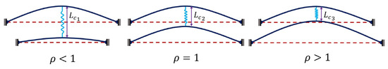 In this section, the impact of the length ratio between the main cables, i.e., , on and will be evaluated. From the stay cable database [51], it is found that the practical range of the length ratio between two neighboring cables on real cable-stayed bridges is from 0.64 to 1.56. Figure 10 shows, schematically, the fundamental mode shape of an unequal-length two-cable network when the target cable is longer, equal to, and shorter than the neighboring cable, respectively. As defined in Figure 2, in the current study, the upper cable (main cable 1) is assumed to be the target cable, whereas the lower one is the neighboring cable. It can be seen from the figure that when 1, the cross-tie would be in compression. This could result in slackening of the cross-tie and would thus lead to its malfunction. In addition, as reported in [28,42], since in the in-phase global mode of a twin-cable network ( 1.0), the two cables oscillate independently, there will be no axial deformation in the cross-tie. Based on these, a length ratio range of 0.6 to 1.0 is chosen for the current study.