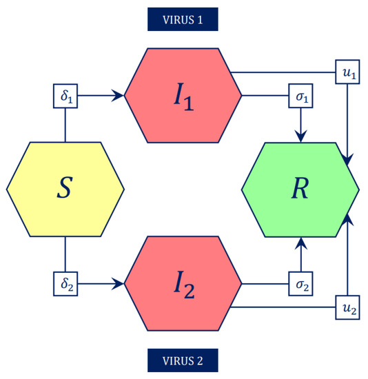 where are infection rates for virus , , are recovery rates (see Figure 1). Infection rate is defined as a product of the contact rate l and transmissibility of infection, i.e., probability of transmission infection during the contact,