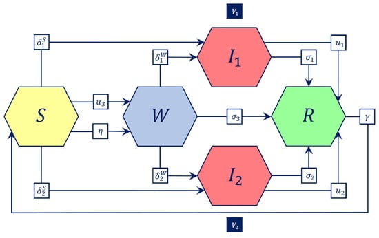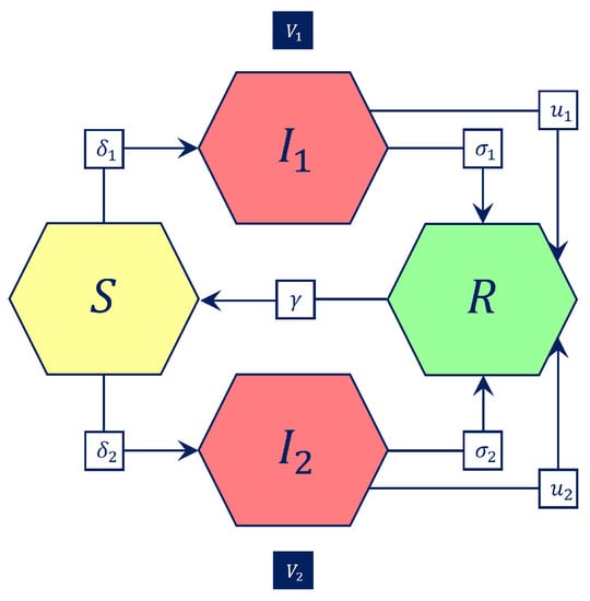 Our model is based on the extended Susceptible–Infected–Recovered model with two types of viruses, which circulate simultaneously in an urban population [6]. A size of population is equal to N. According to these assumptions, we can consider four groups: the Susceptible, the Infected by virus , the Infected by virus , and the Recovered group. Susceptible is a group of people who are not infected by viruses, but can be infected by one or both types of viruses and who have no immunity to the viruses. Depending on the viral strength, we observe that the number of people infected by virus 1 or by virus 2 can be different, and people infected by virus or belong to the subgroup Infected. The Recovered subgroup consists of people who have recovered from the infection. The mixing of populations allows for viruses to spread quickly, and each person in the population is assumed to have an equal probability of coming into contact with others. Therefore, when an infected person interacts with a susceptible person, the virus can spread. A virus with higher virulence, we assume, will have a higher probability of success in spreading when an encounter occurs between the infected and the susceptible. The scheme of process is represented in the Figure 1.