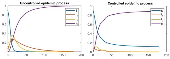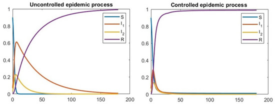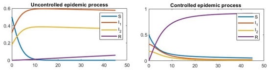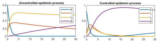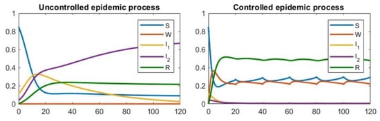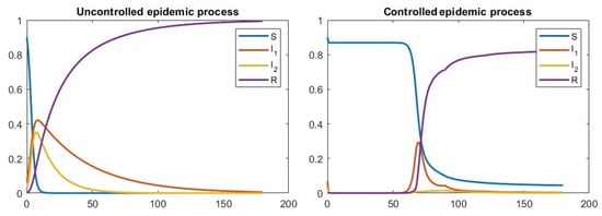 Figure 13 shows the population states in the uncontrolled and controlled cases. It can be seen that the use of the control found with MPC significantly reduces the number of infections. In the uncontrolled case, the maximum proportion of the number of infections is , , and in the controlled case, , , corresponding to the initial proportion of infected in the population.