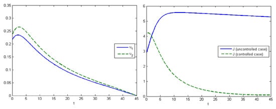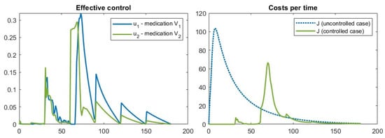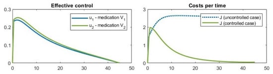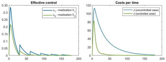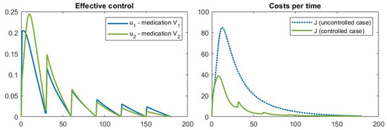 For problems with a modified infection rate parameter, no optimality conditions have yet been found, so the only way to assess the quality of the solution is the cost savings provided by the constructed efficient control. For this reason, the values of the target functional and the total control for the two viruses were calculated for this experiment (see Figure 18). With the combined effect of all controls it was possible to significantly reduce the value of the target function from 33,286 to 11,180 m.u. The benefit of using effective controls was therefore 22,106 m.u.