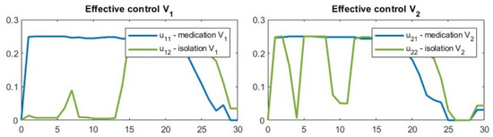 By running the computer simulation program, effective controls for the formulated problem were obtained (see Figure 17). It can be observed that the treatment of individuals for both viruses takes a maximum value starting from and decreases for virus after and for virus after . For , a small fraction () of those infected during are isolated, and after the control turns on again, reaching a maximum value, and turns off after . For , maximum isolation of the infected occurs at , , , and partial isolation at , . Reducing the total number of contacts was most effective in periods .