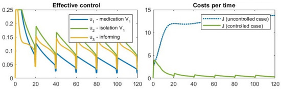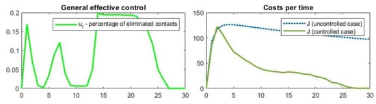 The strategies that increased to and during the first three days of the epidemic and then decreased to zero were found to be effective. The resulting control signals are similar in appearance to the continuous controls presented in the experiments of this paper. The aggregated costs are equal to m.u. in the controlled case and m.u. in the uncontrolled case. Thus, the benefit of using the control is monetary units, which is slightly less than using the optimal control m.u. In Figure 15, we can see the structure of the optimal control for the model and the data from this experiment. It can be observed that the control structure in the case of effective control is similar to the structure in the case of optimal control.
