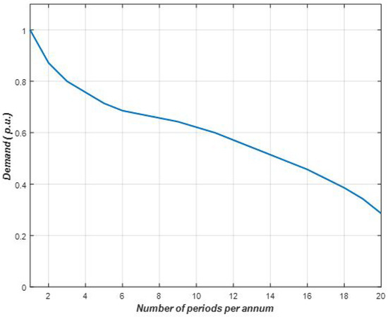The adopted annual load duration curve (similar to that in [34]) for the study, has an assumed 20 periods per annum with randomised different demand states at different times of the year, as shown in Figure 1.
