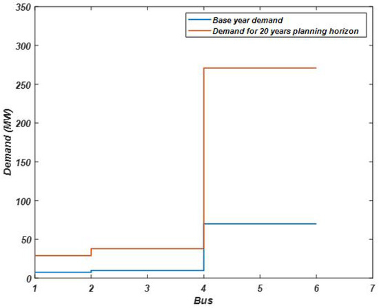 The base year demand and the planning horizon demand for each bus of the network are shown in Figure 3.