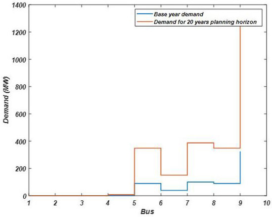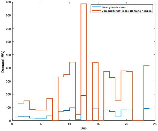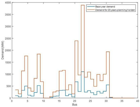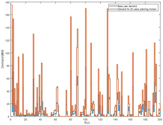 The base year demand and the planning horizon demand at each bus are plotted and compared, as shown in Figure 2.