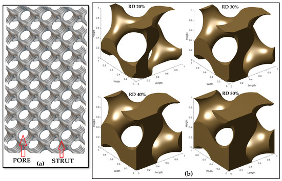 Diseases, injuries, and trauma damage and degenerate tissues in the human body, requiring repair, replacement, and regeneration treatments. After blood, bone is the most common transplanted tissue, and the standard treatment for bone grafts, including the golden standard of autologous grafts, has risks associated with limited donors, donor-site morbidity, contamination, germ transmission, and immune reactions [1]. Bone tissue engineering using three-dimensional (3D) temporary biodegradable or biocompatible porous scaffolds manufactured through additive manufacturing (AM) is developing as a potential replacement for using bone grafts to cure bone injury and recover damaged bone tissues [2,3]. Scaffolds improve stem cells’ adhesion, proliferation, and differentiation to form new tissues in the injured or diseased organs [4]. It also facilitates the flow of waste and nutrients, has a degradation rate that matches neo-tissue growth, and has mechanical properties equivalent to host tissues [5]. Apart from the materials of scaffolds, the architecture of scaffolds is crucial to influencing the mechanical and degradation properties to help bone tissue regeneration and repair the injury [6]. The scaffold architecture has an interconnected pore–strut network of different porosities, which can be achieved by tuning its morphological parameters, such as relative density or volume fraction (Figure 1). Morphological parameters of scaffolds, such as pore and strut sizes, can affect cell behaviour, neo-tissues’ function, and their mechanical stability in tissue regeneration applications [7]. Earlier research showed that a minimum pore size of 100 µm helps transport metabolic wastes, and pore sizes greater than 300 µm enhance the formation of neo-capillaries and neo-bone tissues. Tiny pores induce cell attachment before osteogenesis, and large pores help support vascularisation for successful bone growth [8]. A scaffold design involving pore size, geometry, volume fraction, and its related porosity influences the mechanical performance of scaffolds, especially in terms of stiffness and strength relative to that of natural bone, so that they can withstand different loading conditions [9]. For designing tissue scaffolds without adverse effects on nearby surrounding bone tissues, a close value of effective elastic modulus to that of bone is needed.