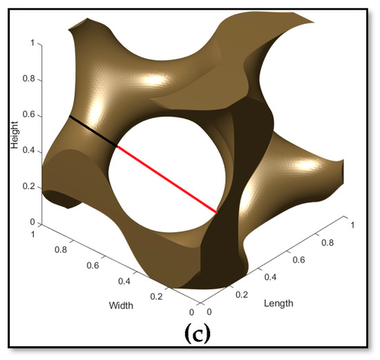 (a) A triply periodic minimal surface-based gyroid scaffold of pore size 1000 µm and strut size of 200 µm with a well-interconnected network of pores and struts helping the movement of oxygen, nutrients, and waste materials. (b) Illustration of how relative density affects volume fraction and influences the morphology of a unit cell. (c) Representative of a gyroid unit cell’s pore size (red) and strut size (black) [6].
