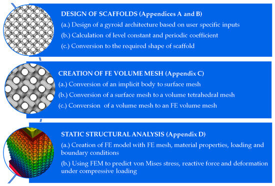 In this research, five uniform scaffolds of gyroid architecture with user-specified inputs of pore size (200 µm to 1000 µm) and strut size (200 µm) were designed based on TPMS and the SDF to achieve the required porosities (approximately 50 to 90%) for bone tissue engineering. Tissue engineering users can specify the precise feature dimensions of a scaffold architecture with this method, and different architectures can be achieved by varying these feature dimensions. Additionally, a computational simulation based on the FEM was performed on these designed scaffolds to evaluate their mechanical behaviours under compressive loading with insight into how the morphological properties affect the mechanical properties, as illustrated by the workflow structure (Figure 2). These given TPMS scaffolds were modelled such that the predicted effective elastic moduli were in the preferable range of human trabecular bone.