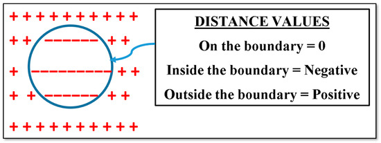 An SDF is a constructive depiction of a shape. It measures distance values to the iso–boundary of a shape (Figure 3) from defined points in 3D space. The positive and negative values of the distances indicate the outside and inside of the boundary of the given shape [19]. The SDF values provide an accurate distance to the zero-level set and define whether the points in the given space are on, outside, or inside the iso-surface [6].