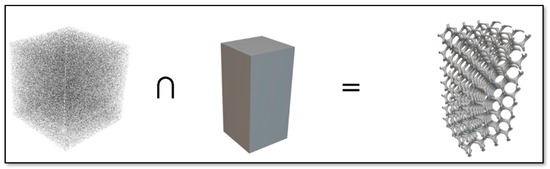 The obtained values of C and N from vi (Appendix A) are fed into the gyroid equation, and the scaffold of required pore and strut sizes is created using mathematical operations. The obtained implicit body of the gyroid is large and can be trimmed into the required shape (5 × 5 × 10 mm cuboid shape in this project) using Boolean intersect (Figure A3). Suppose a user needs an anatomical shape of gyroid architecture with the required pore and strut sizes. The “Boolean intersect” operation must be used between the large implicit gyroid body and the anatomical shape (Figure A3).
