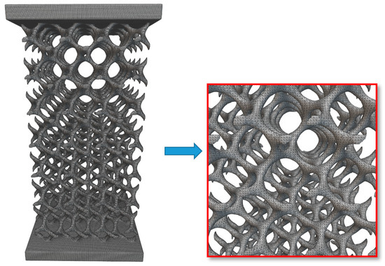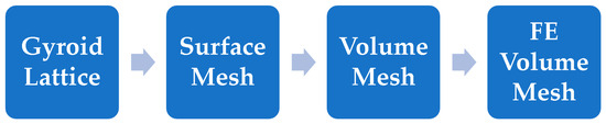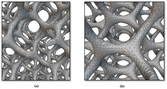 The surface meshes (Figure 7) are technically two-dimensional elements, which are triangles in this case, used to approximate the external surface of the gyroid scaffold. The surface meshes can be exported as 3D printing files such as STL, OBJ, and 3MF for manufacturing. However, simulation does not accept a surface mesh, as this type of mesh does not have volume elements. The obtained surface meshes have closed, manifold, and non-self-intersecting elements. A tolerance of 0.1 mm was used in this conversion to balance between the mesh of reasonable size and computation time. A lower tolerance leads to finer meshes but demands more computation time. A minimum feature size of 0.1 mm was used to clean the mesh. The tolerance value was applied in meshing to discretise the implicit body into smaller elements.