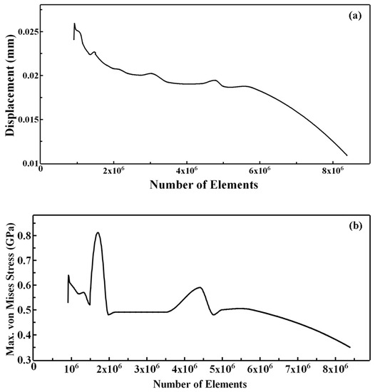 Convergence plots of PS350 for (a) displacement and (b) Max. von Mises Stress (Remaining plots can be viewed in Supplementary Materials Figure S1).