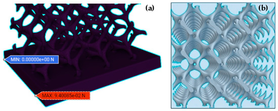 Values of reactive force (Figure 11a), deformation, and von Mises stress were predicted from FE simulation. The equivalent area of the scaffold is 5 × 5 mm2 (Figure 11b), which is required to calculate the compressive stress.